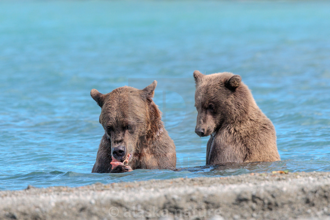 Bears catch fish in Crescent Lake at Lake Clark National Park and Preserve in Alaska during summer days