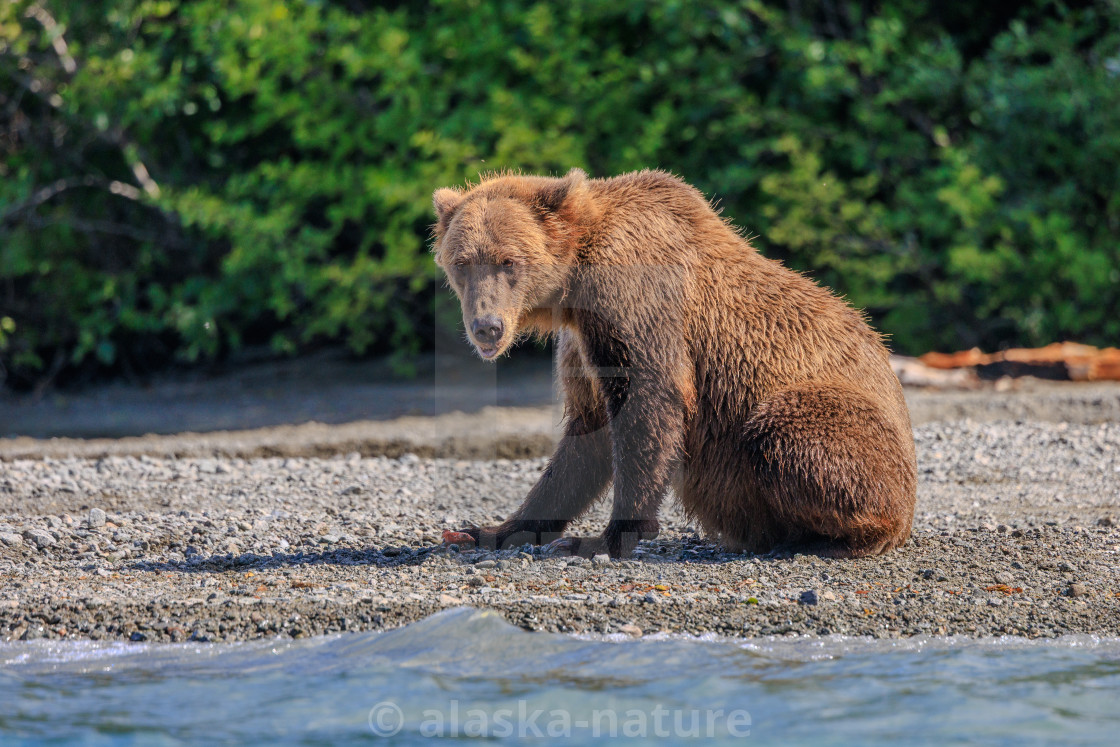 Brown bear resting on the shore of Crescent Lake in Lake Clark National Park and Preserve, Alaska during a sunny day